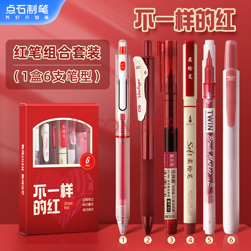 点石制笔批改作业红笔ins风学生中性笔教师老师礼物高颜值红笔芯学生套装340E-1【不一样的红】6支装