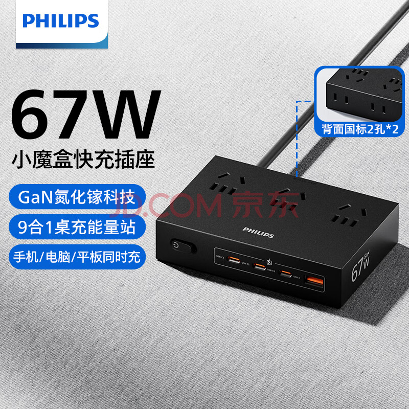 飞利浦(PHILIPS)快充插座带USB氮化镓桌面充电站排插拖线板插线板扩展插座转换器67W小魔盒