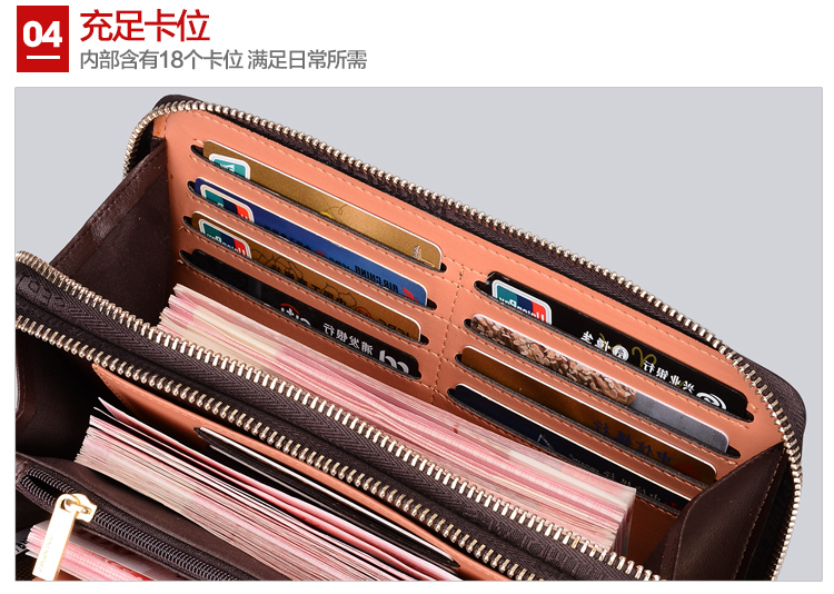 18个卡位,2个夹层,3个大钞位,1个拉链夹层